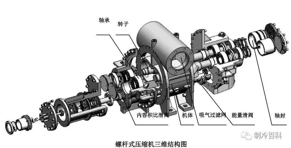 螺杆式制冷压缩属于容积式制冷压缩机, 它利用一对相互啮合的阴阳转子在机体内作回转运动, 周期性地改变转子每对齿槽间的容积来完成吸气、 压缩、 排气过程。