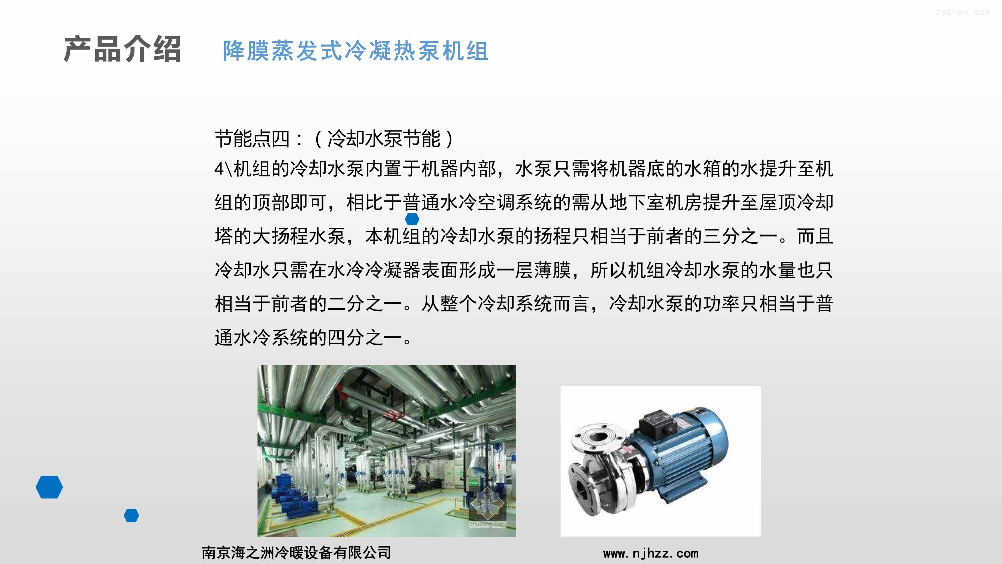 4\机组的冷却水泵内置于机器内部,水泵只需将机器底的水箱的水提升至机组的顶部即可,相比于普通水冷空调系统的需从地下室机房提升至屋顶冷却塔的大扬程水泵,本机组的冷却水泵的扬程只相当于前者的三分之一。而且冷却水只需在水冷冷凝器表面形成一层薄膜,所以机组冷却水泵的水量也只相当于前者的二分之一。从整个冷却系统而言,冷却水泵的功率只相当于普通水冷系统的四分之一。