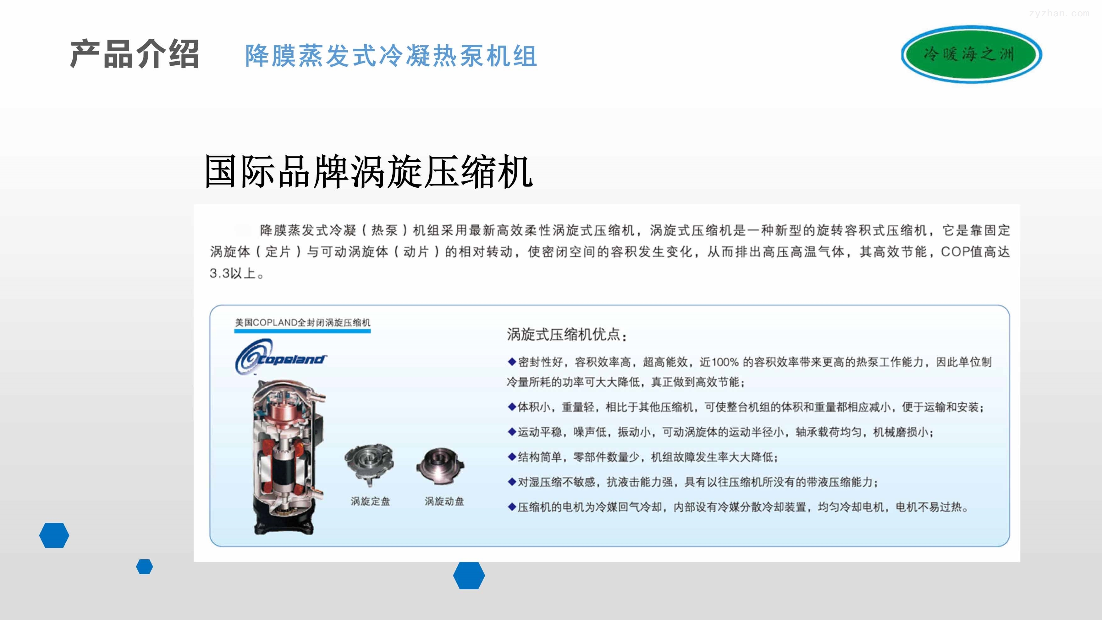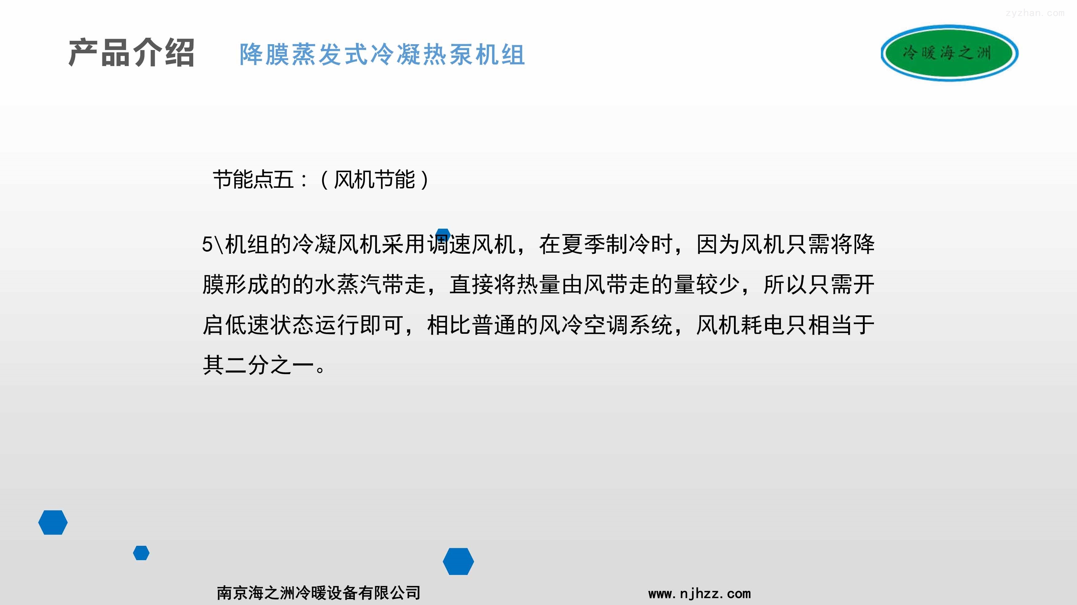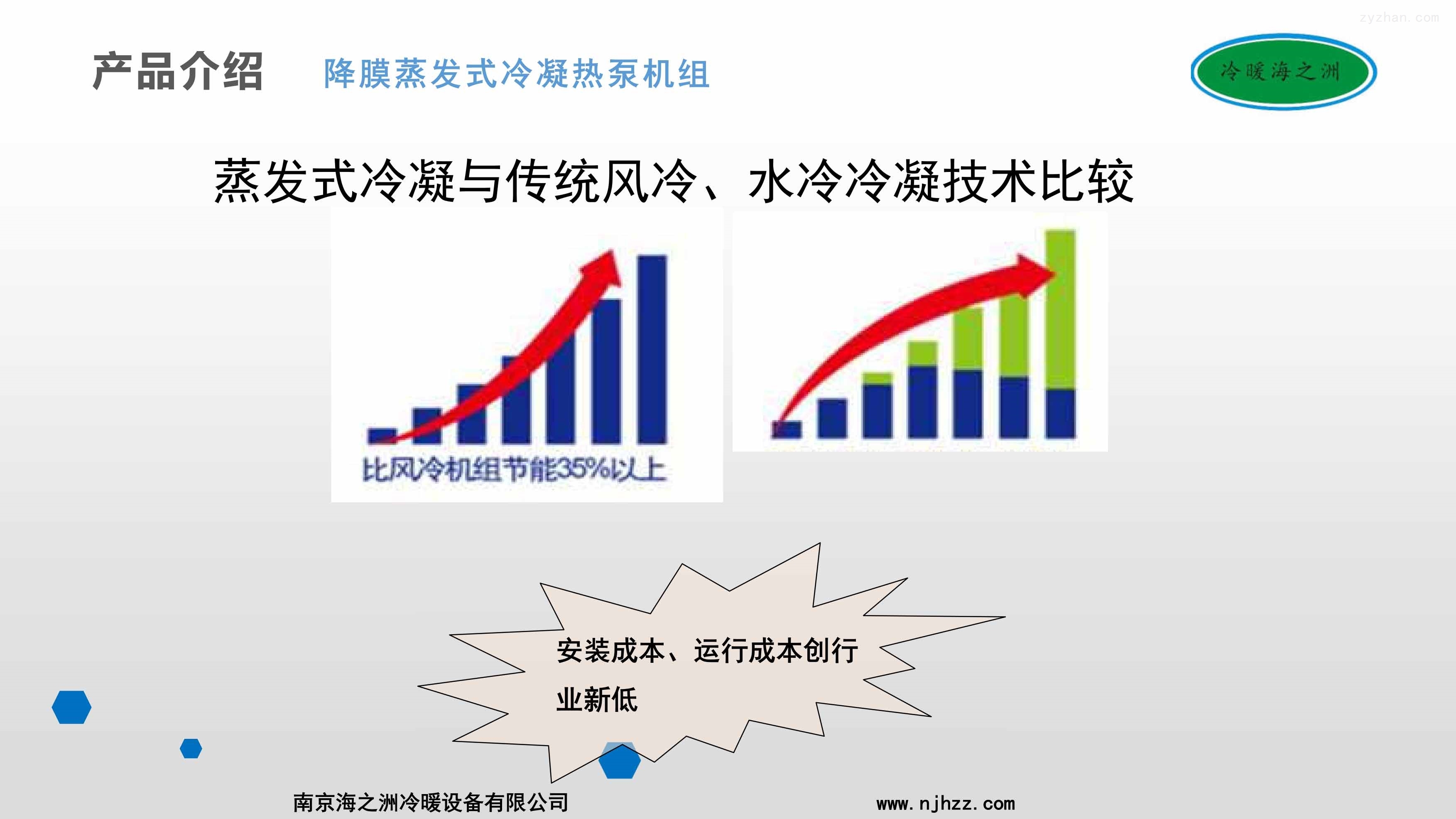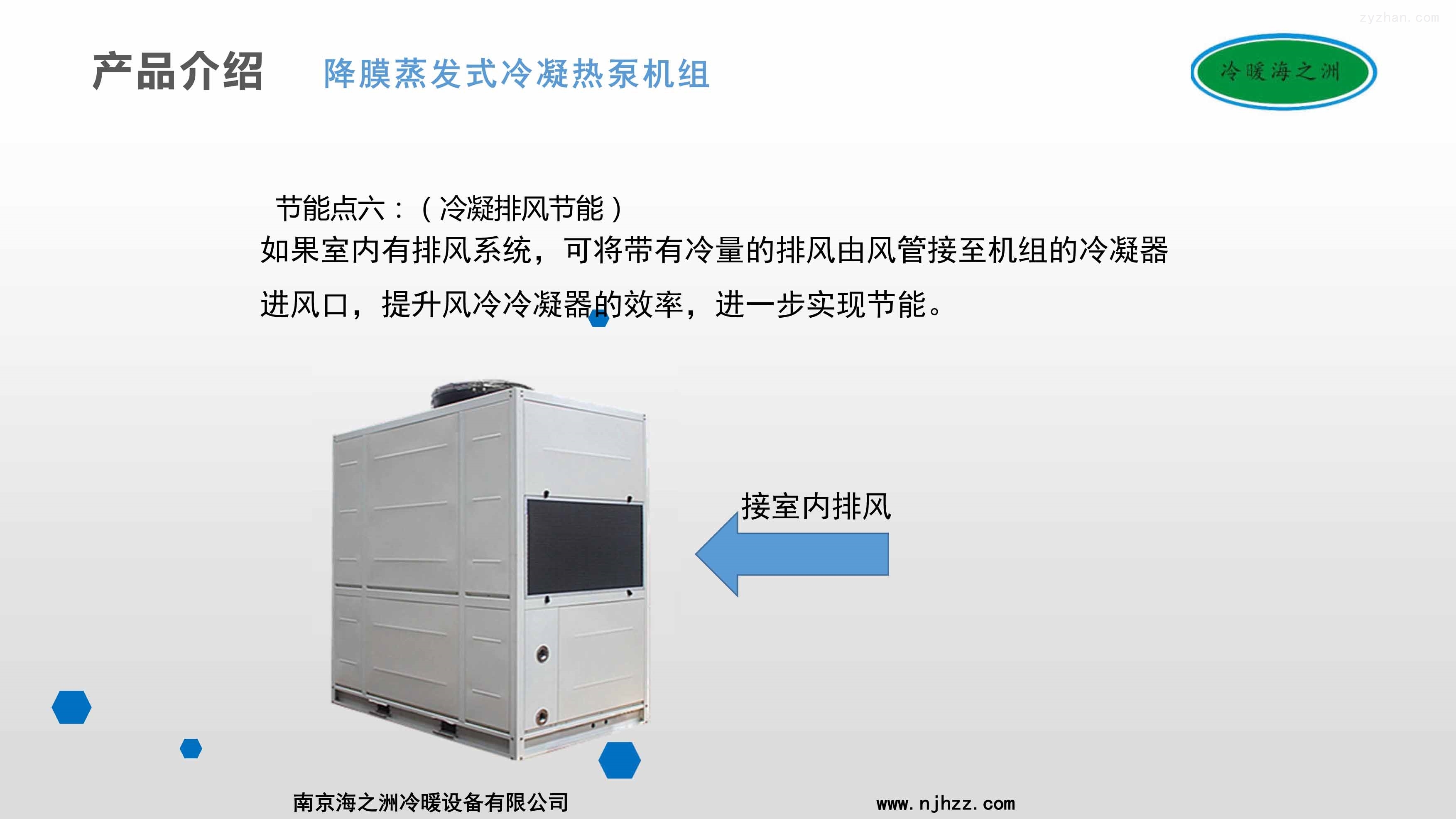 2、机组采用降膜蒸发式水冷冷凝器,其表面有一层特殊金属涂层,由机内冷却水管喷出的水雾,在冷凝器盘管表面可形成一道连续下降的薄膜,换热后形成水蒸汽经风扇排出机组,表面无干点,不形成水珠,利用水的汽化潜热将机组的热量排走,提高水冷冷凝器的换热效率,相比市面上普通的双冷源机组效率提升在10%以上。