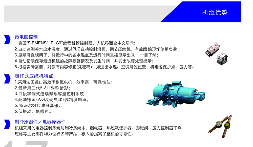 ★冷水机组干燥过滤等主要部件均为世界产品,提高了冷水机组整机的可靠性。
