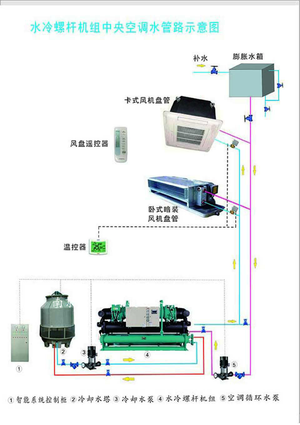 水机工作原理:水系统空调由室外主机和室内末端装置组成,通过室外主机提供空调冷/热水,由水管系统输送到室内末端装置,水与空气在室内末端处进行热交换来消除房间冷/热负荷。是一种集中产生冷/热量,但分散处理各房间负荷的空调系统型式。