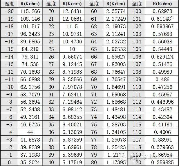 《空调管温传感器(10K)温度-电阻对照表》 单位: 温度℃/电阻K