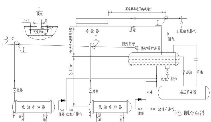 热虹吸油冷却器的结构同水冷油冷却器的原理类似, 为卧式壳管式, 油在管外, 制冷剂在管内。经冷凝器冷凝后流出的制冷剂液体流入热虹吸贮液器后分流出一路液体进入热虹吸油冷却器, 沿途吸收管外高温油的热而蒸发。制冷剂在蒸发过程中密度逐渐减小, 油冷回气管中的气液混合物的密度低于油冷却器供液管中液体的密度, 这种不平衡产生了一个压力差使制冷剂在油冷却器中流动。经热虹吸油冷却器冷却后的油温度一般比冷凝温度高 10~20℃。热虹吸系统设计、 安装时应注意: