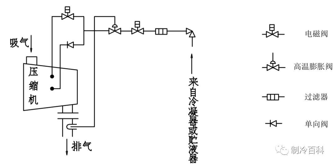 带喷液冷却的机组中, 有一路由本机组或系统中的冷凝器或贮液器引出的高压制冷剂液体, 经过过滤器、节流阀或高温膨胀阀后喷入压缩机某中间孔口, 起吸收压缩热并冷却油温的作用。高温膨胀阀的开启度取决定于排气温度, 当排气温度偏高(高于55℃) 时, 膨胀阀开启度增大;当排气温度偏低(低于50℃) 时, 膨胀阀开启度减小。压缩机上开有两个喷液孔口高位喷液口和低位喷液口,制冷剂液体从低位喷液口喷入,则从高位喷液口喷入。带喷液装置的机组中省却了油冷却器, 使机组外形简洁, 体积更小。
