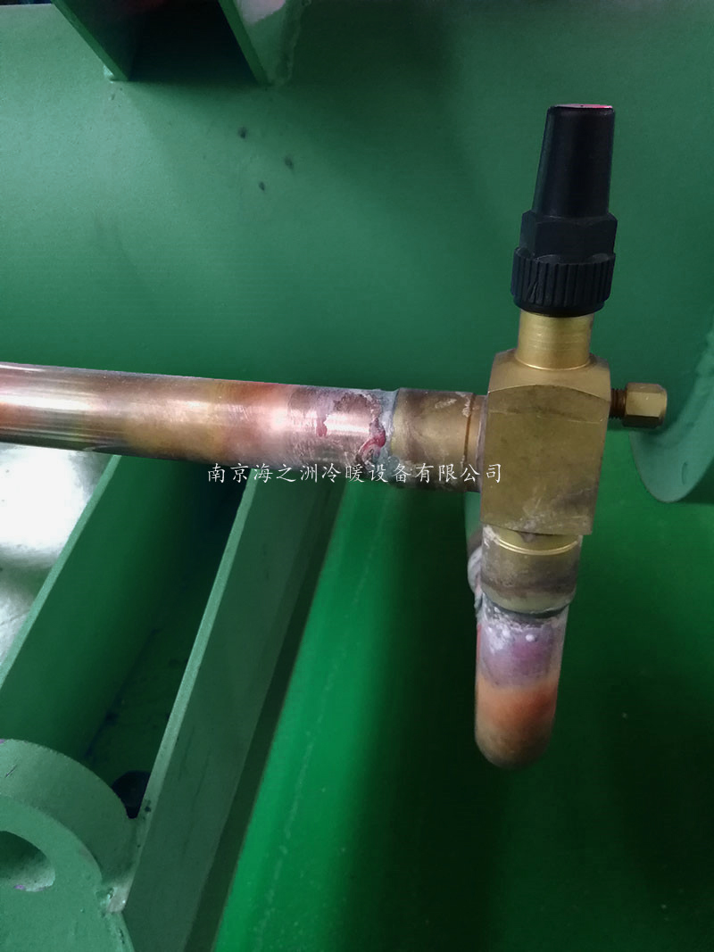维修操作:用泡泡水沫涂上,检查连接处是否有气泡吹出。若没有,可以从低压气体阀门旁路咀加制冷剂,以低压0.5MPa为准。停机用洗涤灵再检查纳子连接处,3~5分钟后仍没有汽泡产生,说明连接处漏气故障排除。