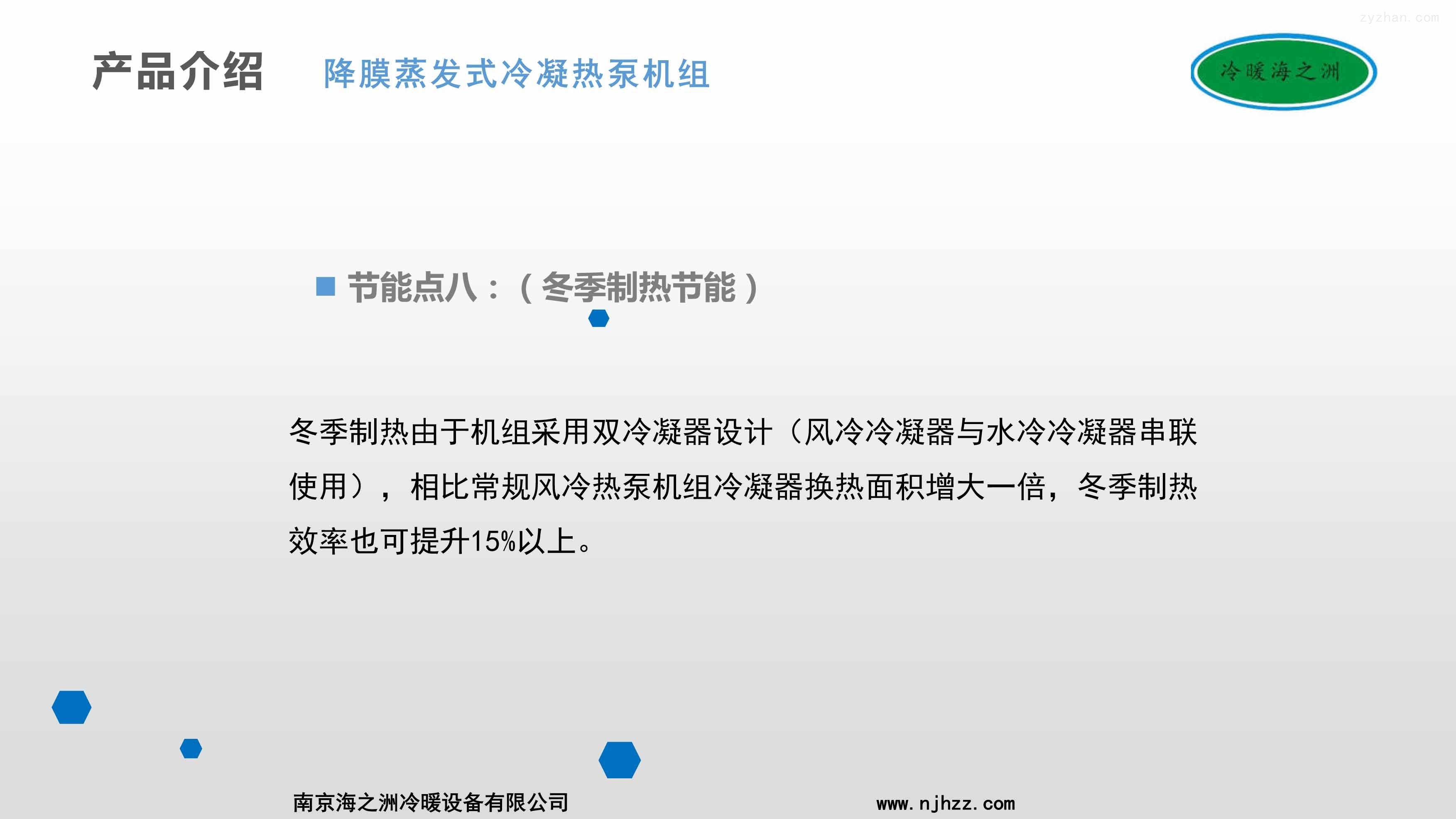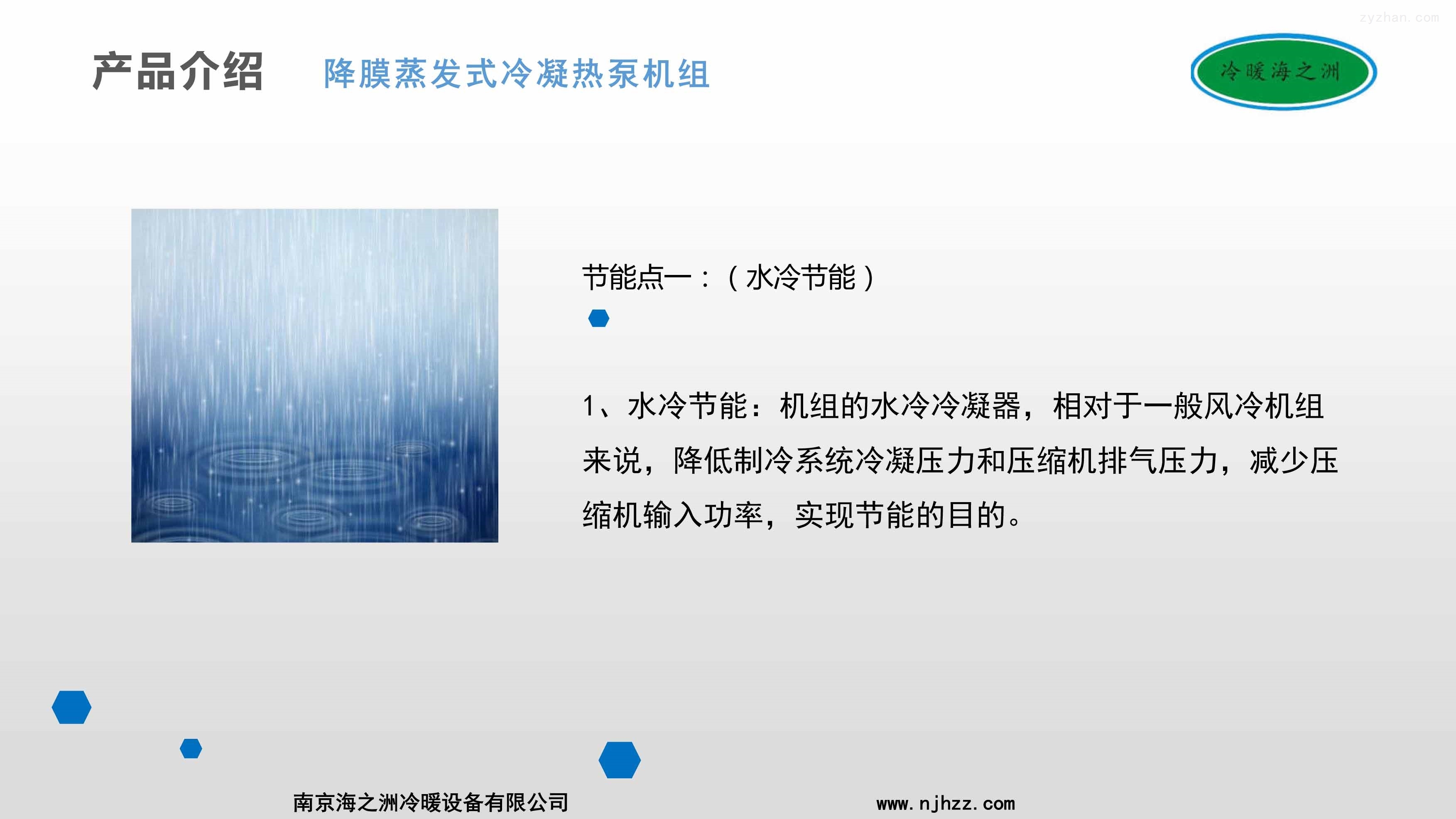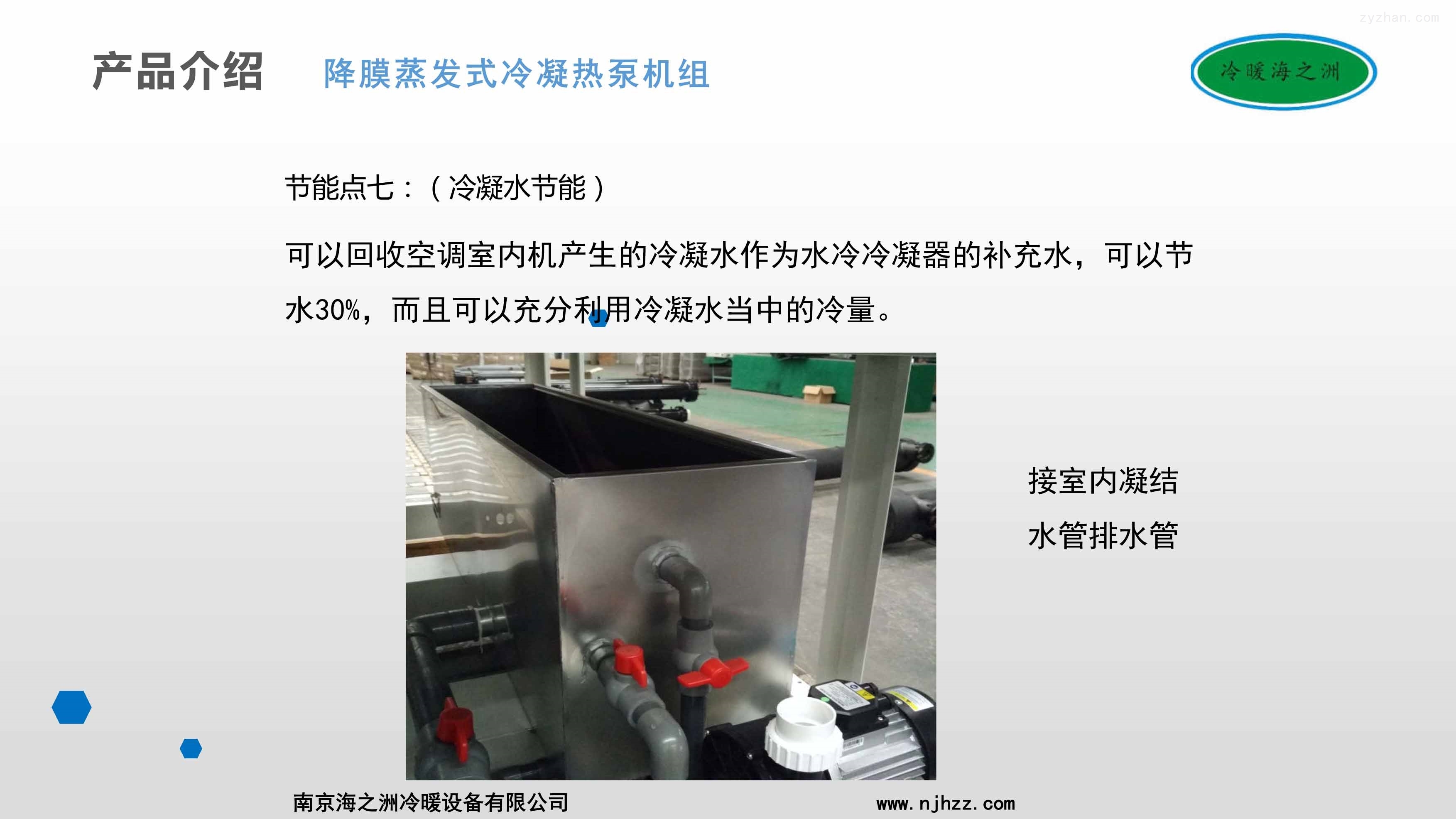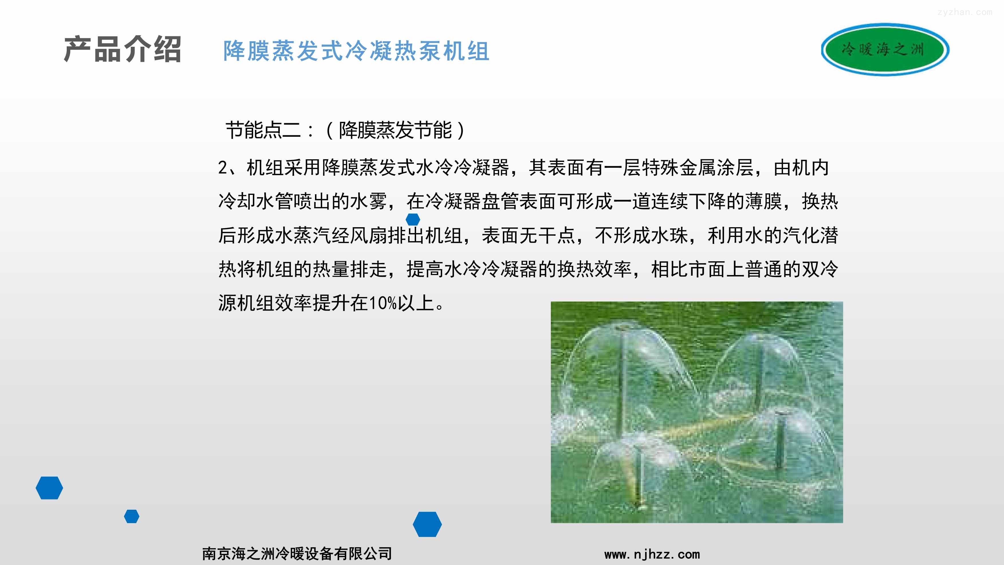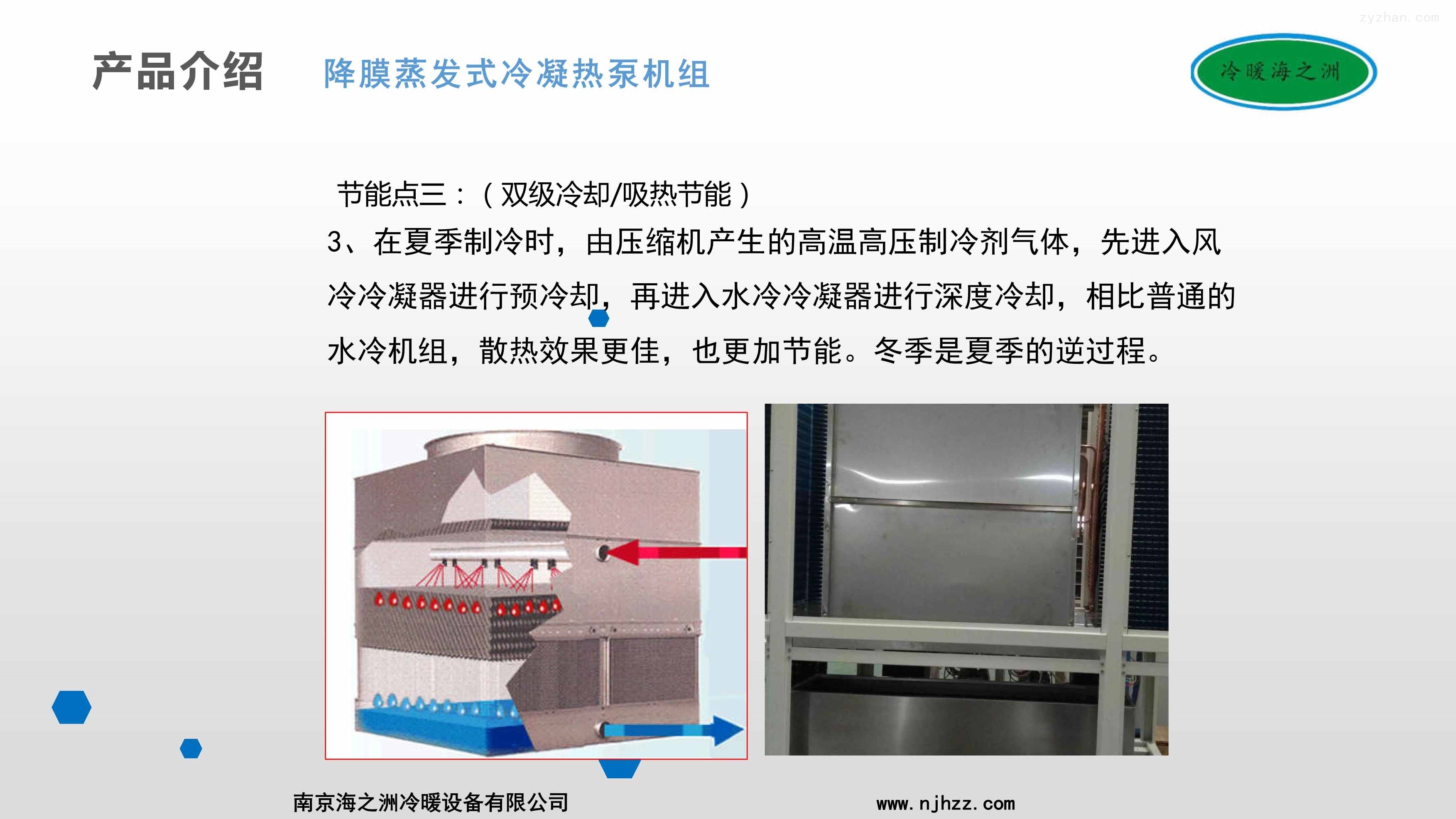 2、机组采用降膜蒸发式水冷冷凝器,其表面有一层特殊金属涂层,由机内冷却水管喷出的水雾,在冷凝器盘管表面可形成一道连续下降的薄膜,换热后形成水蒸汽经风扇排出机组,表面无干点,不形成水珠,利用水的汽化潜热将机组的热量排走,提高水冷冷凝器的换热效率,相比市面上普通的双冷源机组效率提升在10%以上。