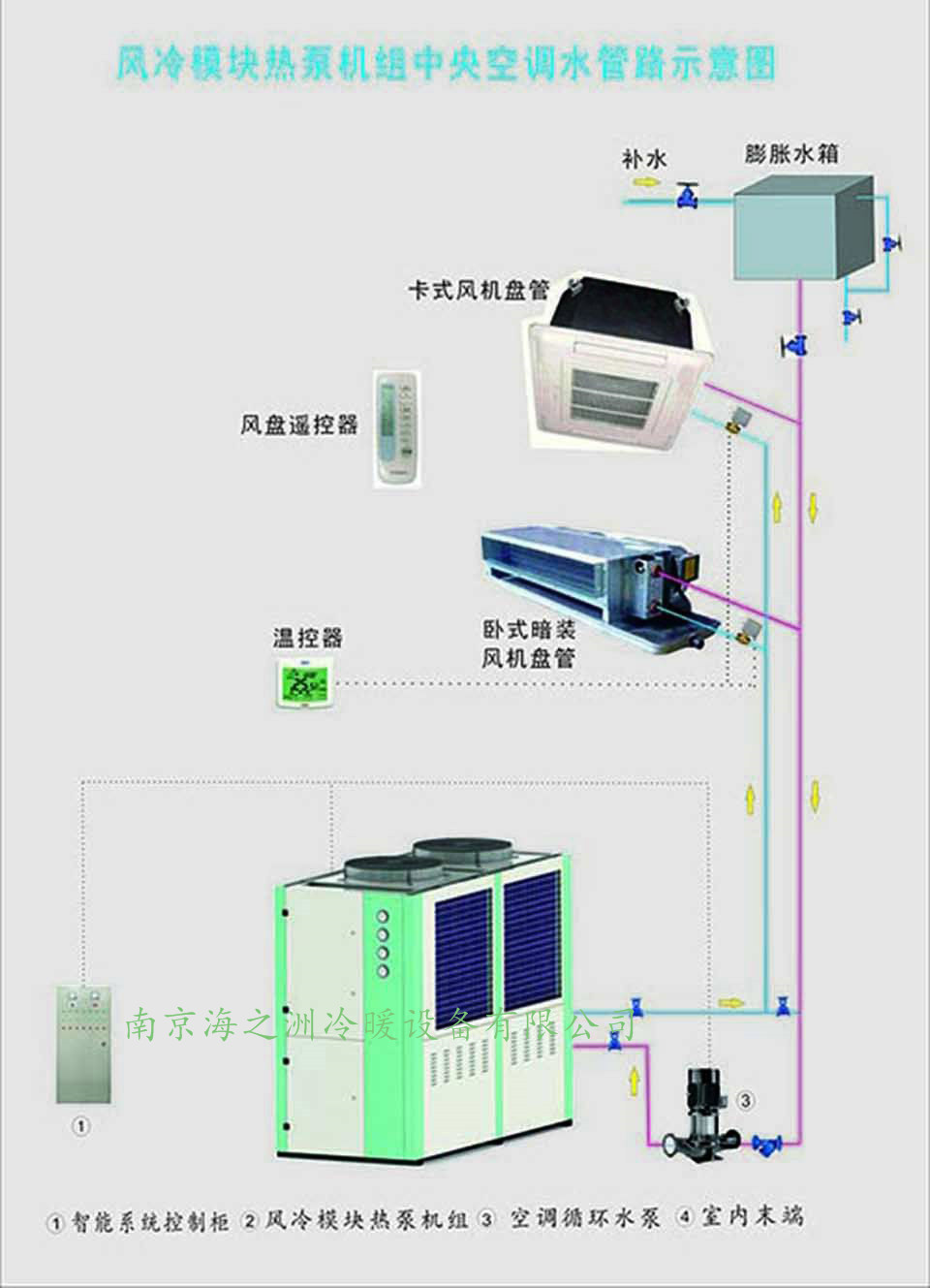 风冷模块机采用模块化设计,模块之间通过水管、电线相连,组合灵活、安装方便。风冷模块机组采用微电脑控制,液晶显示,全自动运行,具有断水、防冻、高压、低压、缺(逆)相等保护及水温设定,实时温度显示、故障检测与查询、自动进行能量调节与平衡压缩机磨损、自动除霜、远程控制等功能。