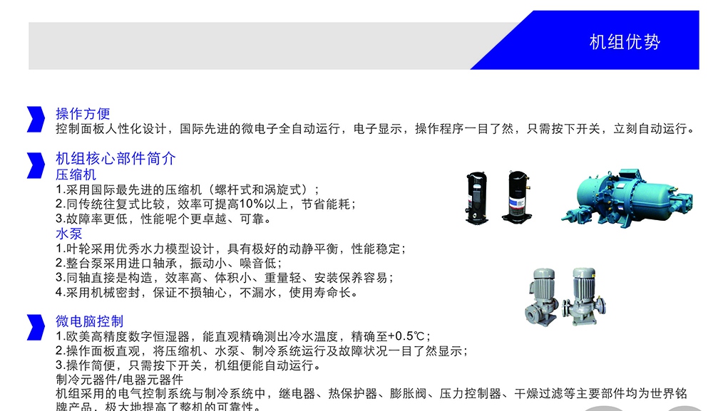 ★冷水机组干燥过滤等主要部件均为世界产品,提高了冷水机组整机的可靠性。